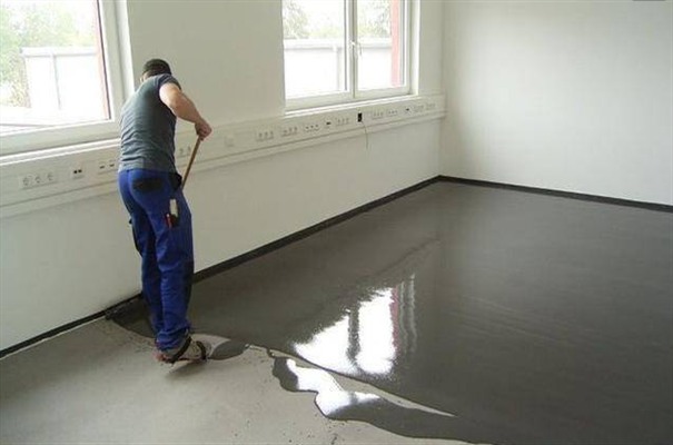 在界面劑干燥之后,就可以將攪拌好的自流平水泥倒在地上,倒到地面上之后,水泥可以順著地面流淌,但是不能完全流平,需要施工人員用工具推桿水泥,將水泥推開推平。
