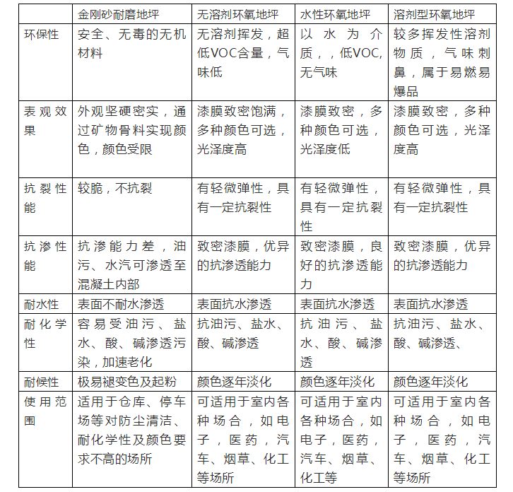環(huán)氧地坪是由高性能環(huán)氧樹脂及固化劑組成,是一種整體無(wú)縫、高強(qiáng)度、美觀的地面保護(hù)系統(tǒng)。根據(jù)不同的工藝與材料,大致分為:環(huán)氧磨石地坪、環(huán)氧彩砂地坪、環(huán)氧薄涂地坪、環(huán)氧自流平地坪、環(huán)氧防靜電地坪、環(huán)氧耐腐蝕地坪、水性環(huán)氧地坪系列等。