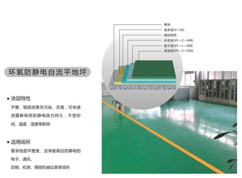 環(huán)氧樹脂防靜電地坪具有表面平整,美觀,整體無(wú)縫,易清潔,易維修,防靜電效果長(zhǎng)期持久有效,造價(jià)低等特點(diǎn),可廣泛適用于電子電器制造,微機(jī)計(jì)算機(jī)精密設(shè)備,電氣控制,印刷,紡織,軍工等一切需要防靜電或防爆場(chǎng)所的地面涂裝。