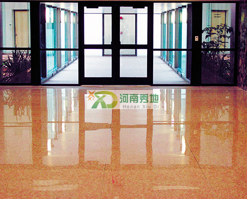 以純環(huán)氧樹脂配合彩色石英砂增加地坪的耐磨損、耐強力沖擊等性能,且裝飾效果好。