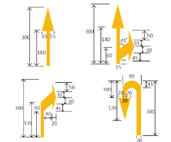 B﹑箭頭—引導(dǎo)車輛行駛方向,在車場內(nèi)適當?shù)奈恢脴酥緦?dǎo)向箭頭,按國家標準長為300mm.顏色為白色。
