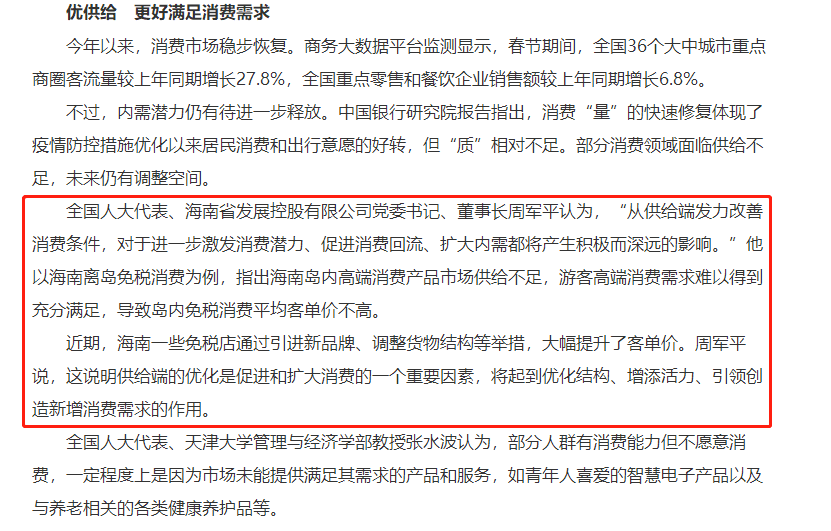 報道圍繞“如何讓消費‘熱’起來?怎樣解決不便消費、不愿消費、不敢消費等突出問題以釋放消費潛力?”采訪全國兩會代表委員。報道提及:全國人大代表、海南省發(fā)展控股有限公司黨委書記、董事長周軍平認(rèn)為,“從供給端發(fā)力改善消費條件,對于進(jìn)一步激發(fā)消費潛力、促進(jìn)消費回流、擴大內(nèi)需都將產(chǎn)生積極而深遠(yuǎn)的影響?!彼院D想x島免稅消費為例,指出海南島內(nèi)高端消費產(chǎn)品市場供給不足,游客高端消費需求難以得到充分滿足,導(dǎo)致島內(nèi)免稅消費平均客單價不高。近期,海南一些免稅店通過引進(jìn)新品牌、調(diào)整貨物結(jié)構(gòu)等舉措,大幅提升了客單價。周軍平說,這說明供給端的優(yōu)化是促進(jìn)和擴大消費的一個重要因素,將起到優(yōu)化結(jié)構(gòu)、增添活力、引領(lǐng)創(chuàng)造新增消費需求的作用。