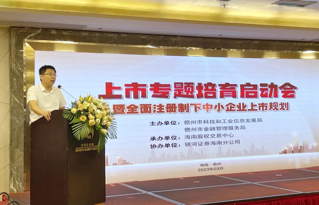 3月29日上午,上市專題培育啟動會暨全面注冊制下中小企業(yè)上市規(guī)劃活動在儋州成功舉辦。儋州市人民政府副秘書長姚玥悅,儋州市科技和工業(yè)信息發(fā)展局副局長陳泉治,海南金融控股股份有限公司黨總支委員、總經(jīng)理助理朱磊,銀河證券海南分公司總經(jīng)理陳衛(wèi)紅,海南股交執(zhí)行總經(jīng)理吳杰及當(dāng)?shù)仄髽I(yè)代表、新聞媒體記者近70人參加活動。